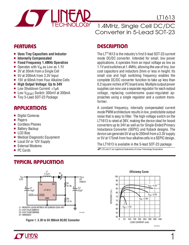 LT1613 1.4MHz, Single Cell DC/DC Converter in 5-Lead SOT-23