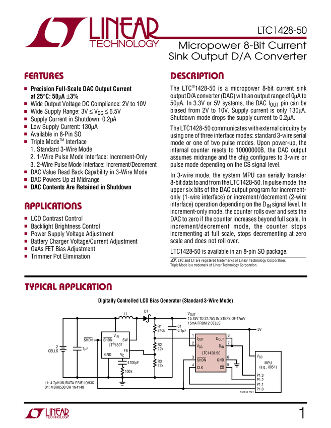 LTC1428-50 Micropower 8-Bit Current Sink Output D/A Converter