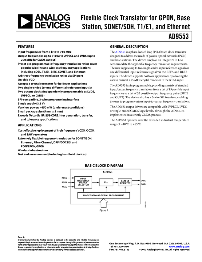 AD9553 Flexible Clock Translator for GPON, Base Station, SONET/SDH, T1/E1, and Eth...