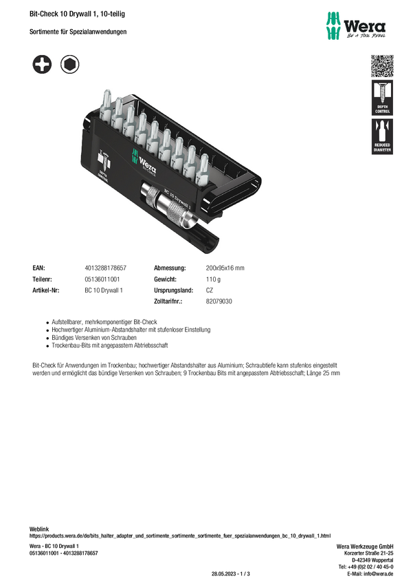 05136011001 Bity Wera Bit-Check 10 Drywall 1 05136011001 1 szt.