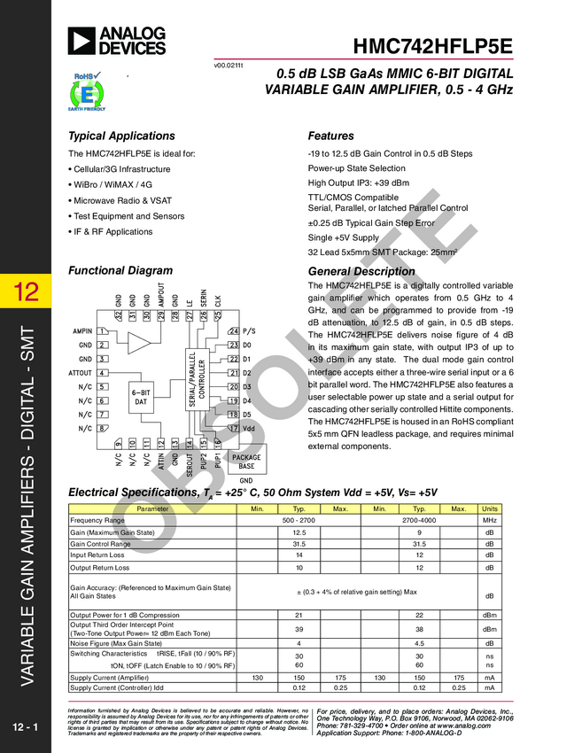 HMC742 6-Bit Digital Variable Gain Amplifier SMT, 0.5 - 4 GHz