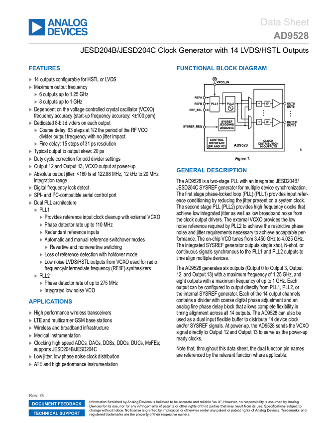 AD9528 JESD204B/JESD204C Clock Generator with 14 LVDS/HSTL Outputs