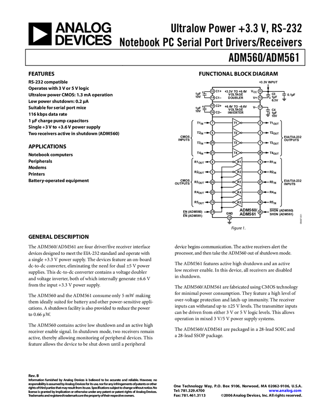 ADM560 Ultralow Power, Active High Shutdown and an Active Low Receiver Enable