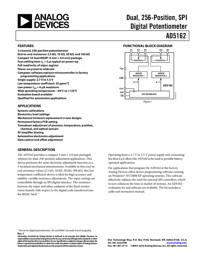 AD5162 256-Position Dual Channel SPI Digital Potentiometer