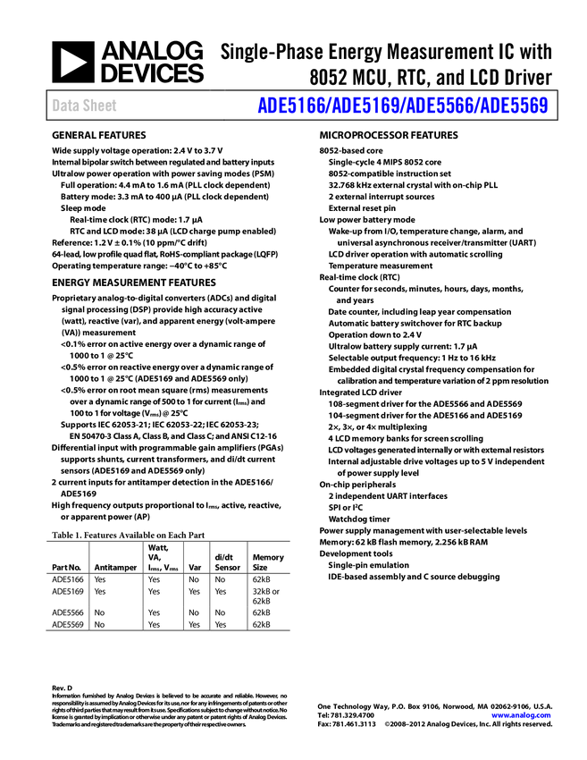ADE5166 Single-Phase Energy Measurement IC with 8052 MCU, RTC, and LCD Driver