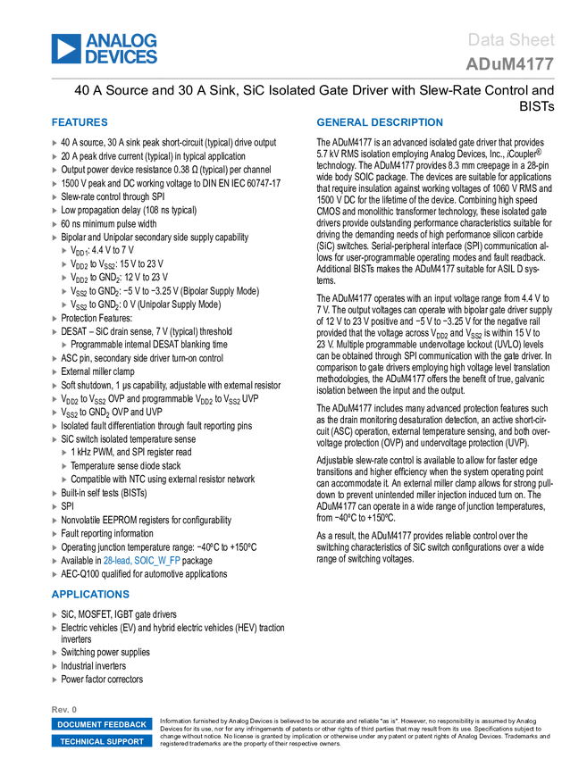 ADuM4177 40 A Source and 30 A Sink, SiC Isolated Gate Driver with Slew-Rate Control...