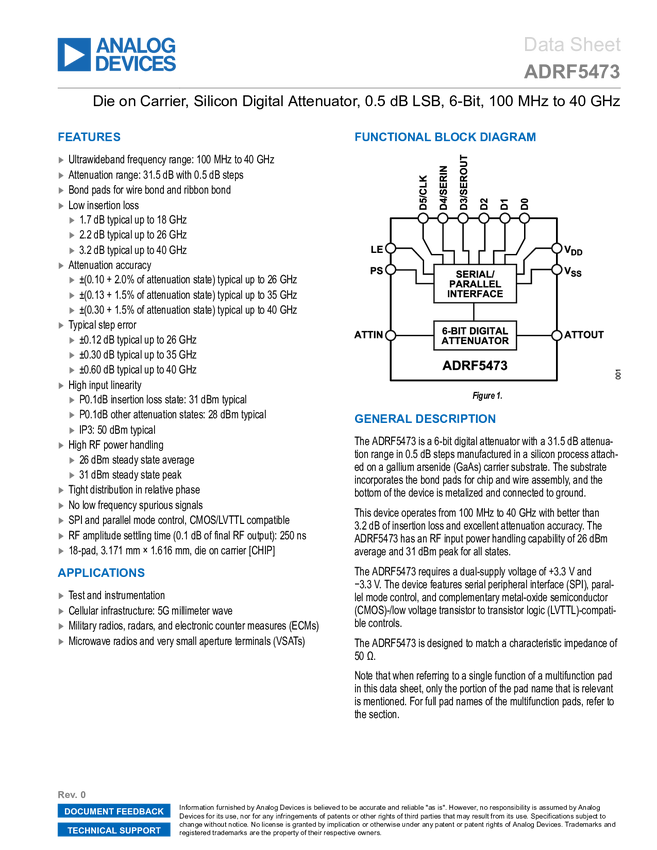 ADRF5473 Die on Carrier, Silicon Digital Attenuator, 0.5 dB LSB, 6-Bit, 100 MHz to 4...