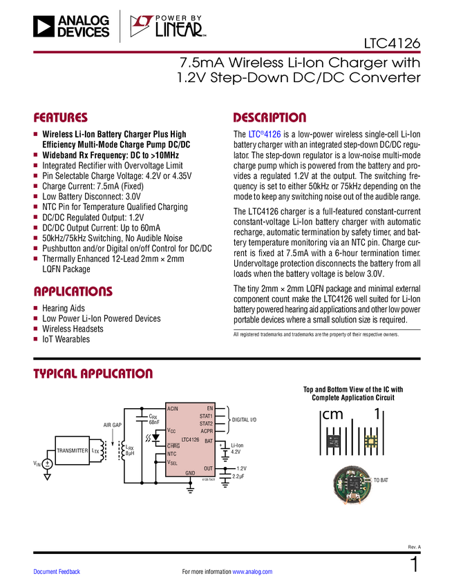 LTC4126 7.5mA Wireless Li-Ion Charger with 1.2V Step-Down DC/DC Converter