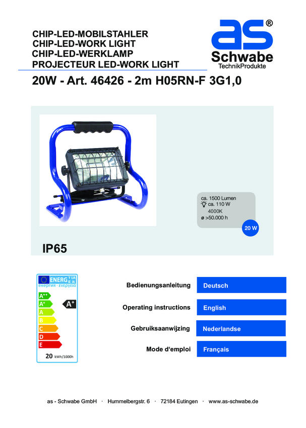 AS Schwabe Reflektor roboczy LED EEK F (A - G) 20 W 1700 lm biały 46426
