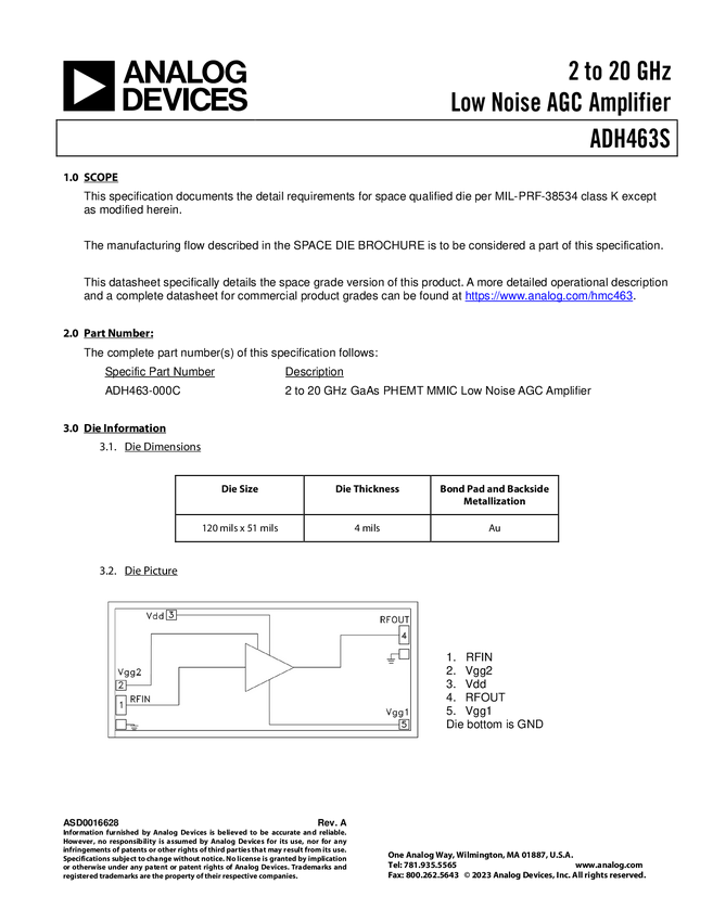 ADH463S Aerospace GaAs, Low Noise AGC Amplifier 2 to 20 GHz, LH250 Package