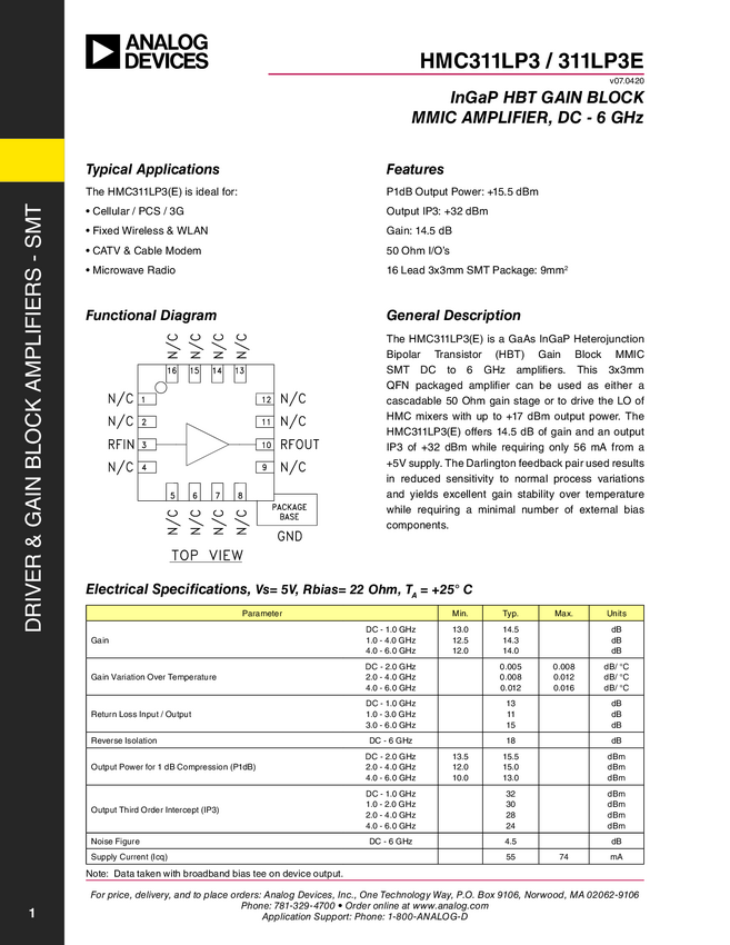HMC311LP3 InGaP HBT Gain Block MMIC Amplifier, DC - 6 GHz