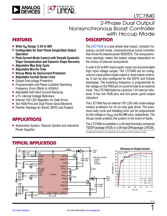 LTC7840 2-Phase Dual Output Non-Synchronous Boost Controller with Hiccup Mode
