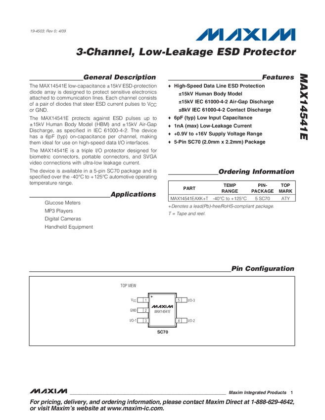 MAX14541E 3-Channel, Low-Leakage ESD Protector