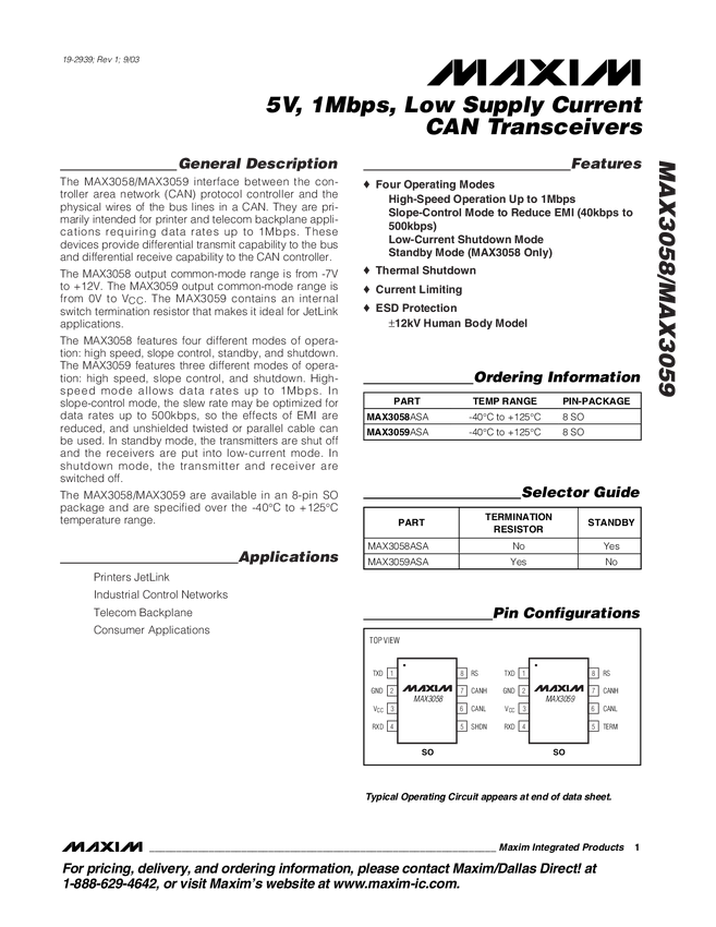 MAX3059 5V, 1Mbps, Low Supply Current CAN Transceivers
