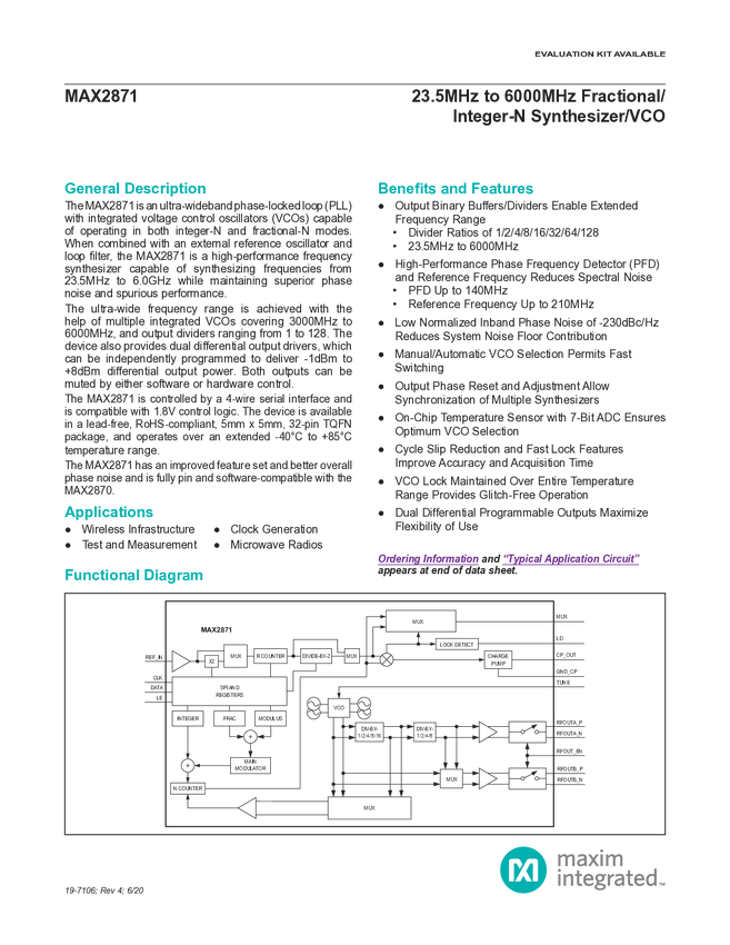 MAX2871 23.5MHz to 6000MHz Fractional/Integer-N Synthesizer/VCO