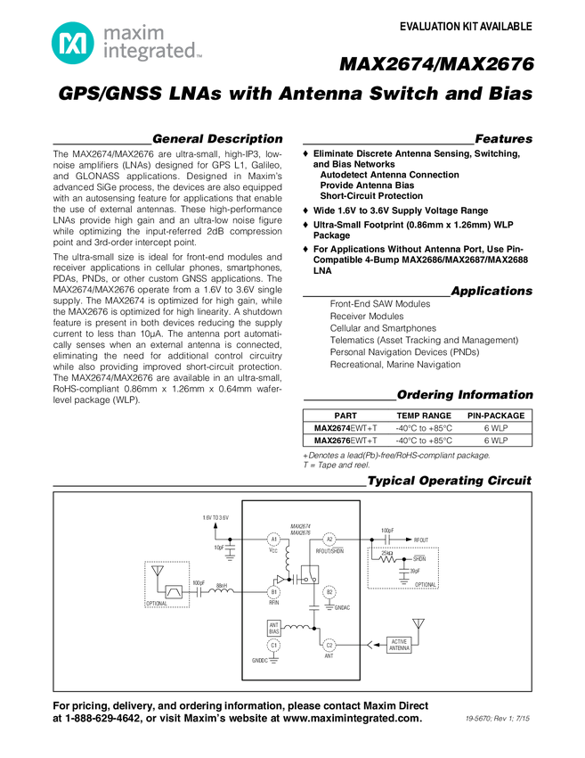 MAX2674 GPS/GNSS LNAs with Antenna Switch and Bias