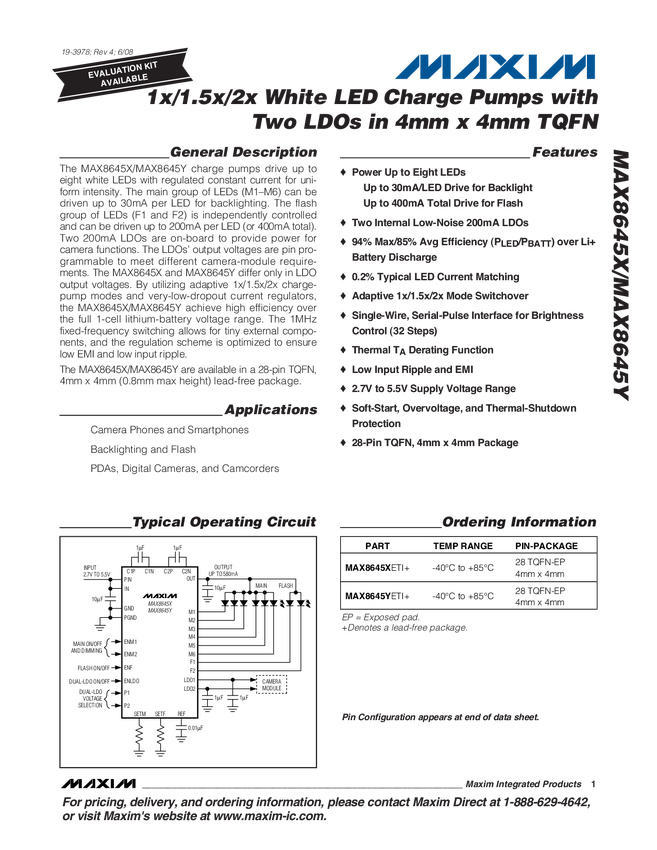 MAX8645X 1x/1.5x/2x White LED Charge Pumps with Two LDOs in 4mm x 4mm TQFN