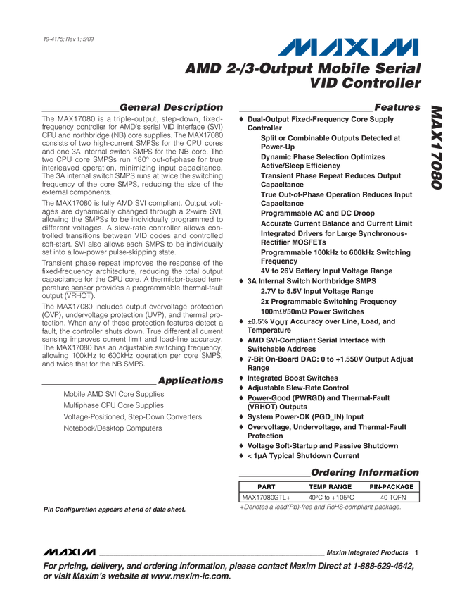 MAX17080 AMD 2-/3-Output Mobile Serial VID Controller