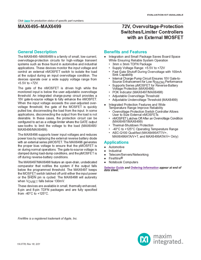 MAX6497 72V, Overvoltage-Protection Switches/Limiter Controllers with an External M...