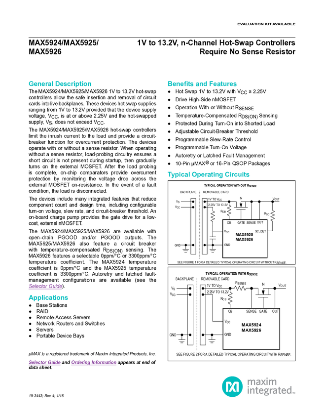 MAX5924 1V to 13.2V, n-Channel Hot-Swap Controllers Require No Sense Resistor