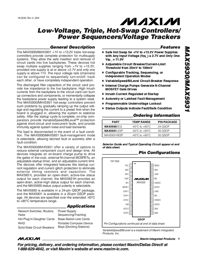 MAX5930 Low-Voltage, Triple, Hot-Swap Controllers/Power Sequencers/Voltage Trackers