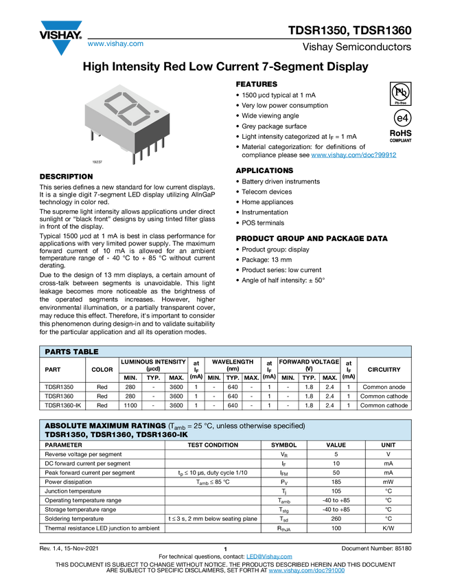 TDSR1360 High Intensity Red Low Current 7-Segment Display