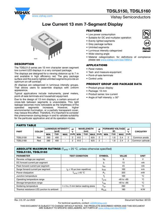 TDSL5160 Low Current 13 mm 7-Segment Display