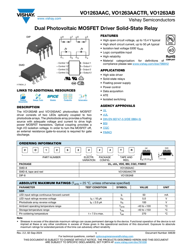 VO1263AAC Dual Photovoltaic MOSFET Driver Solid-State Relay