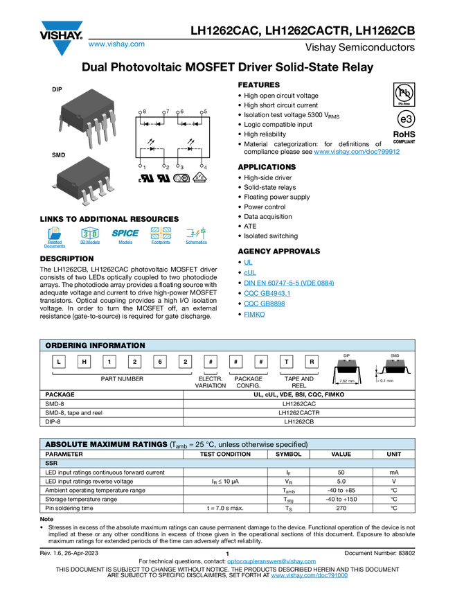 LH1262CAC Dual Photovoltaic MOSFET Driver Solid-State Relay