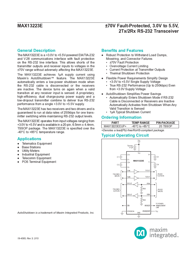 MAX13223E ±70V Fault-Protected, 3.0V to 5.5V, 2Tx/2Rx RS-232 Transceiver