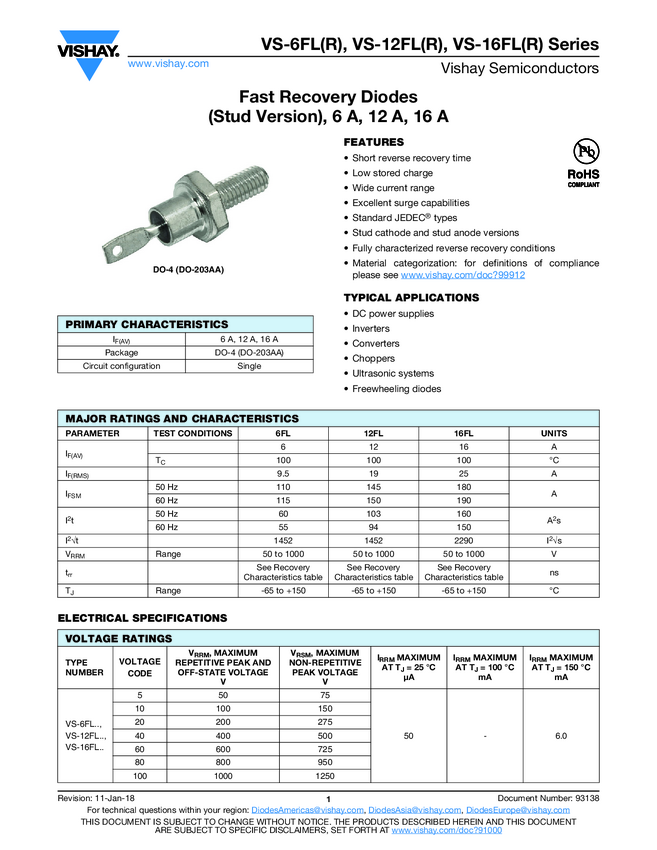 VS-6FL(R) Fast Recovery Diodes (Stud Version), 6 A, 12 A, 16 A