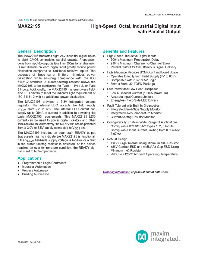 MAX22195 High-Speed, Octal, Industrial Digital Input with Parallel Output