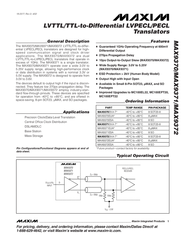 MAX9370 LVTTL/TTL-to-Differential LVPECL/PECL Translators