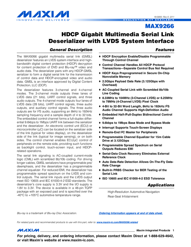 MAX9266 HDCP Gigabit Multimedia Serial Link Deserializer with LVDS System Interface