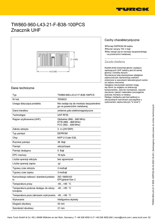 7030623 Transponder RFID Turck TW860-960-L43-21-P-B38 100pcs 7030623, 100 szt.
