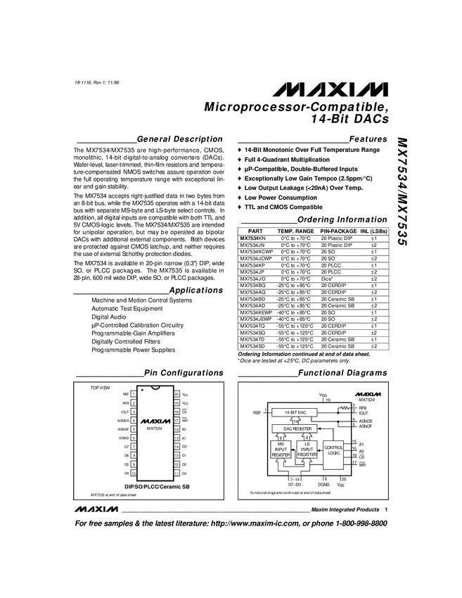 MX7534 Microprocessor-Compatible, 14-Bit DACs