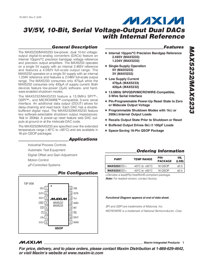 MAX5232 3V/5V, 10-Bit, Serial Voltage-Output Dual DACs with Internal Reference
