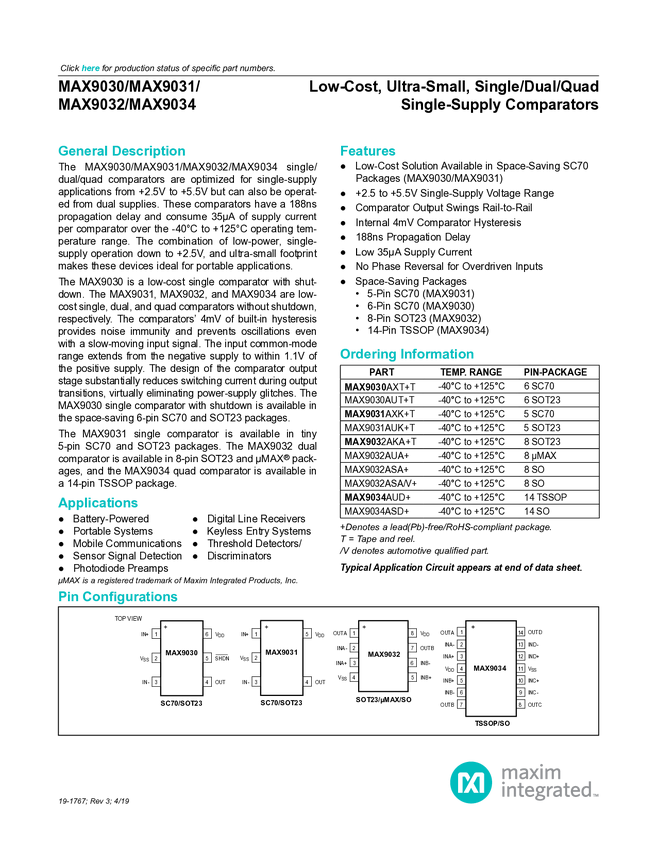MAX9030 Low-Cost, Ultra-Small, Single/Dual/Quad Single-Supply Comparators