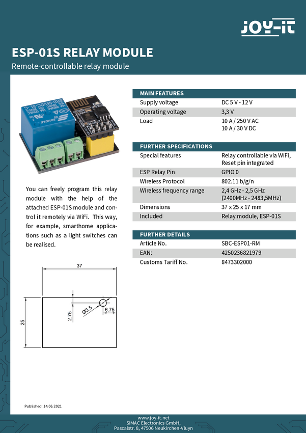 Joy-it ESP01-RM Moduł przekaźnika ESP01-RM