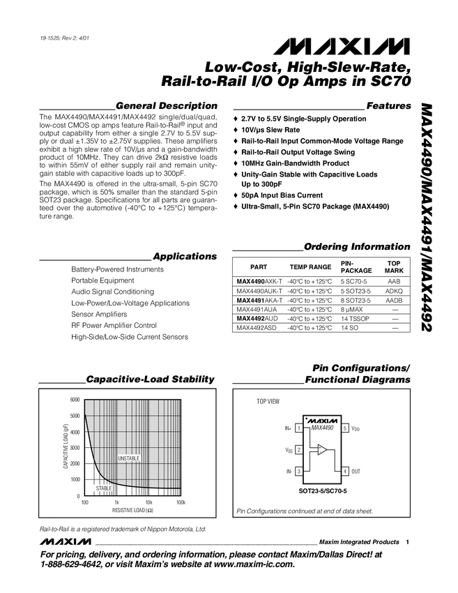 MAX4490 Low-Cost, High-Slew-Rate, Rail-to-Rail I/O Op Amps in SC70