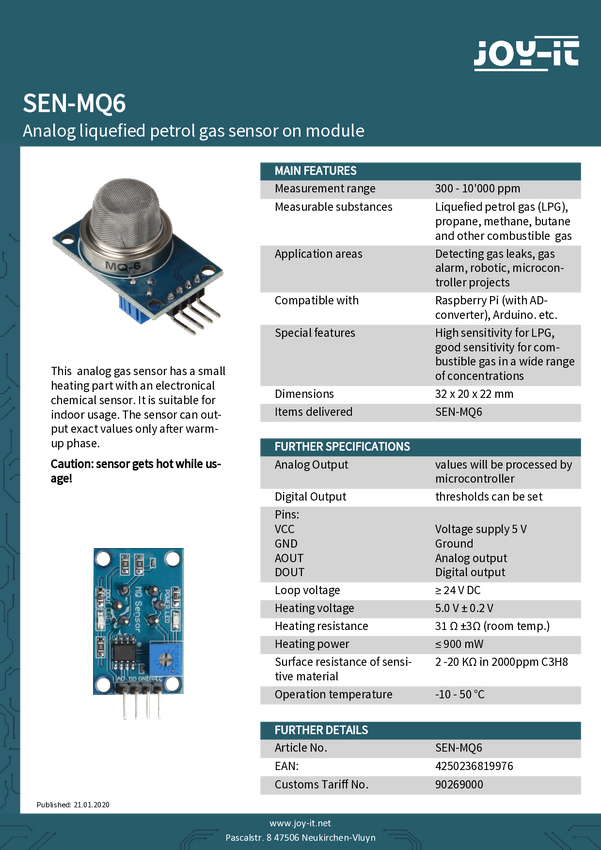 Moduł czujnika Joy-it sen-mq6 Zestaw czujnika 1 szt.