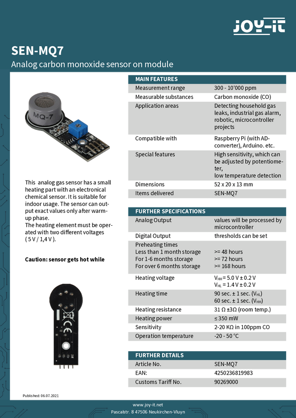 Czujnik tlenku węgla Joy-it sen-mq7 1 szt.