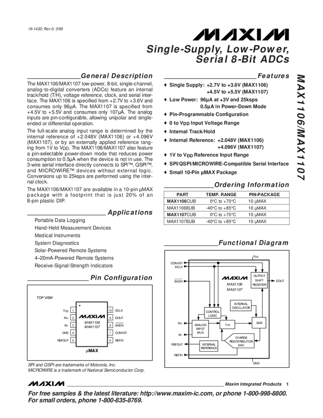MAX1107 Single-Supply, Low-Power, Serial 8-Bit ADCs