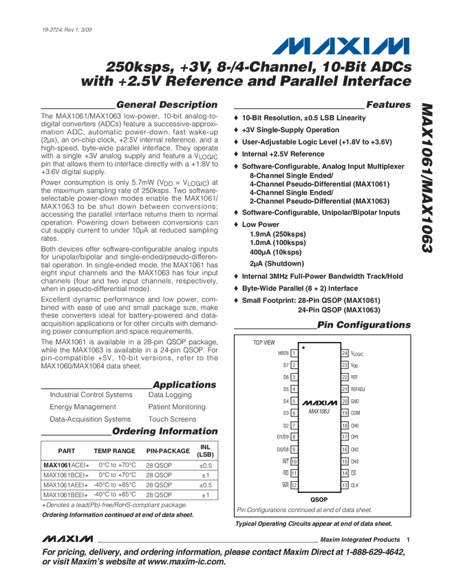 MAX1063 250ksps, +3V, 8-/4-Channel, 10-Bit ADCs with +2.5V Reference and Parallel I...