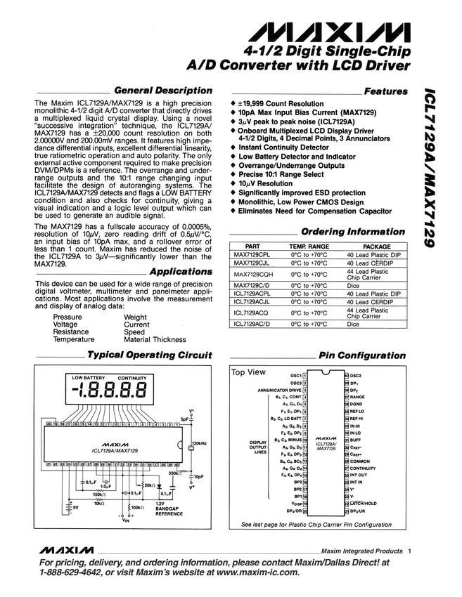 ICL7129A Low-Noise, 4 1/2 Digit, Single-Chip ADC with Multiplexed LCD Drivers