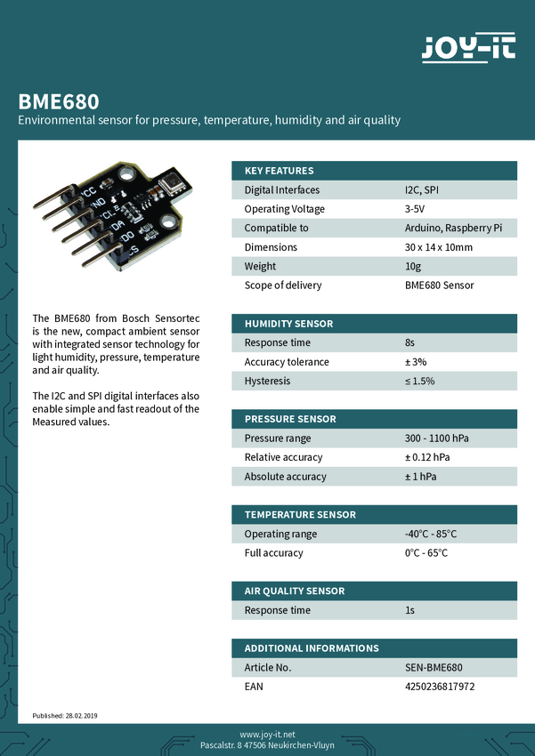 SEN-BME680 Moduł czujnika Joy-it SEN-BME680 1 szt.