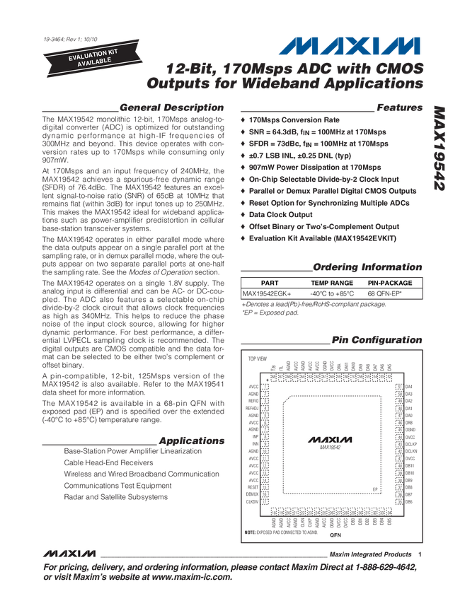 MAX19542 12-Bit, 170Msps ADC with CMOS Outputs for Wideband Applications