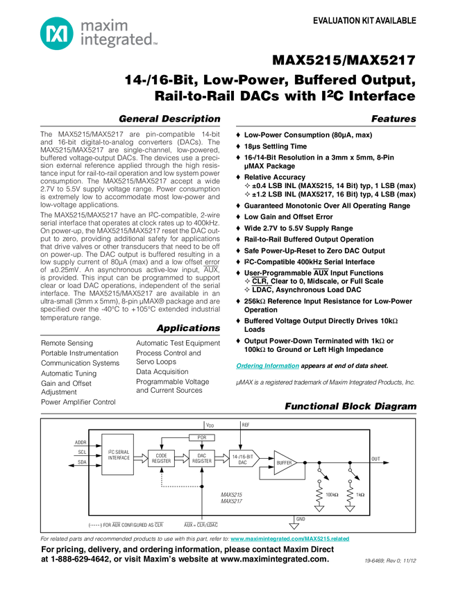 MAX5215 14-/16-Bit, Low-Power, Buffered Rail-to-Rail DACs with I²C Interface