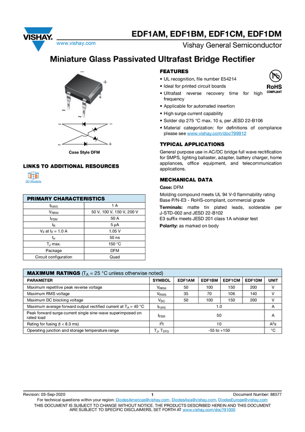 EDF1BM Miniature Glass Passivated Ultrafast Bridge Rectifier