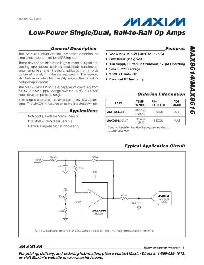 MAX9614 Low-Power Single/Dual, Rail-to-Rail Op Amps